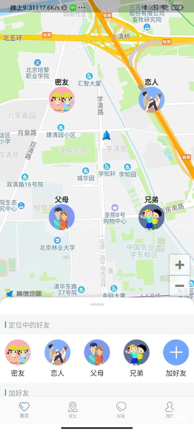 当极果君点开这个软件,等待了几秒“粗制劣造”的广告之后,终于进入了这款软件的主界面,整页的地图看上去就让人感觉“它能成大事”。下面有着几个头像,标注着密友、恋人、父母、兄弟等等,看着还算正常。